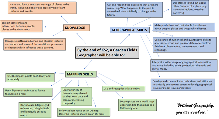 At Garden Fields we aim to provide a highly skills-based Geography education. Children will be inspired and curious about the world around them and taught the skills to investigate and deepen their knowledge. These skills are taught in a progressive way across the school to enable the children to further their skill sets each year.